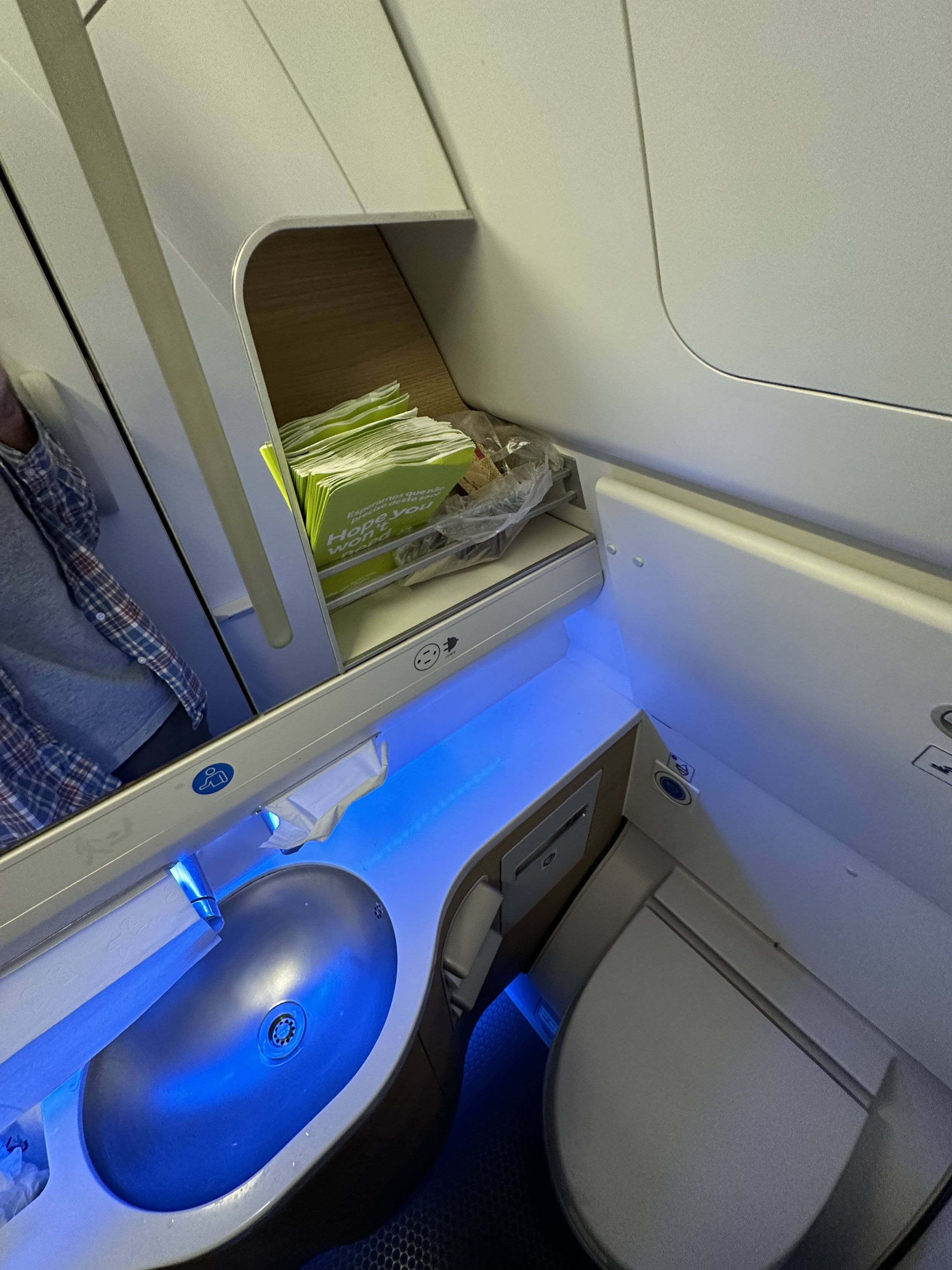 In regards to the bathroom, it was somewhat unremarkable. It was kept relatively clean throughout the flight, and had some unique mood lighting underneath the mirror. However, it was quite small and the only bathroom amentities offered were pre-packaged moist toilettes. It is just an airplane bathroom, after all.