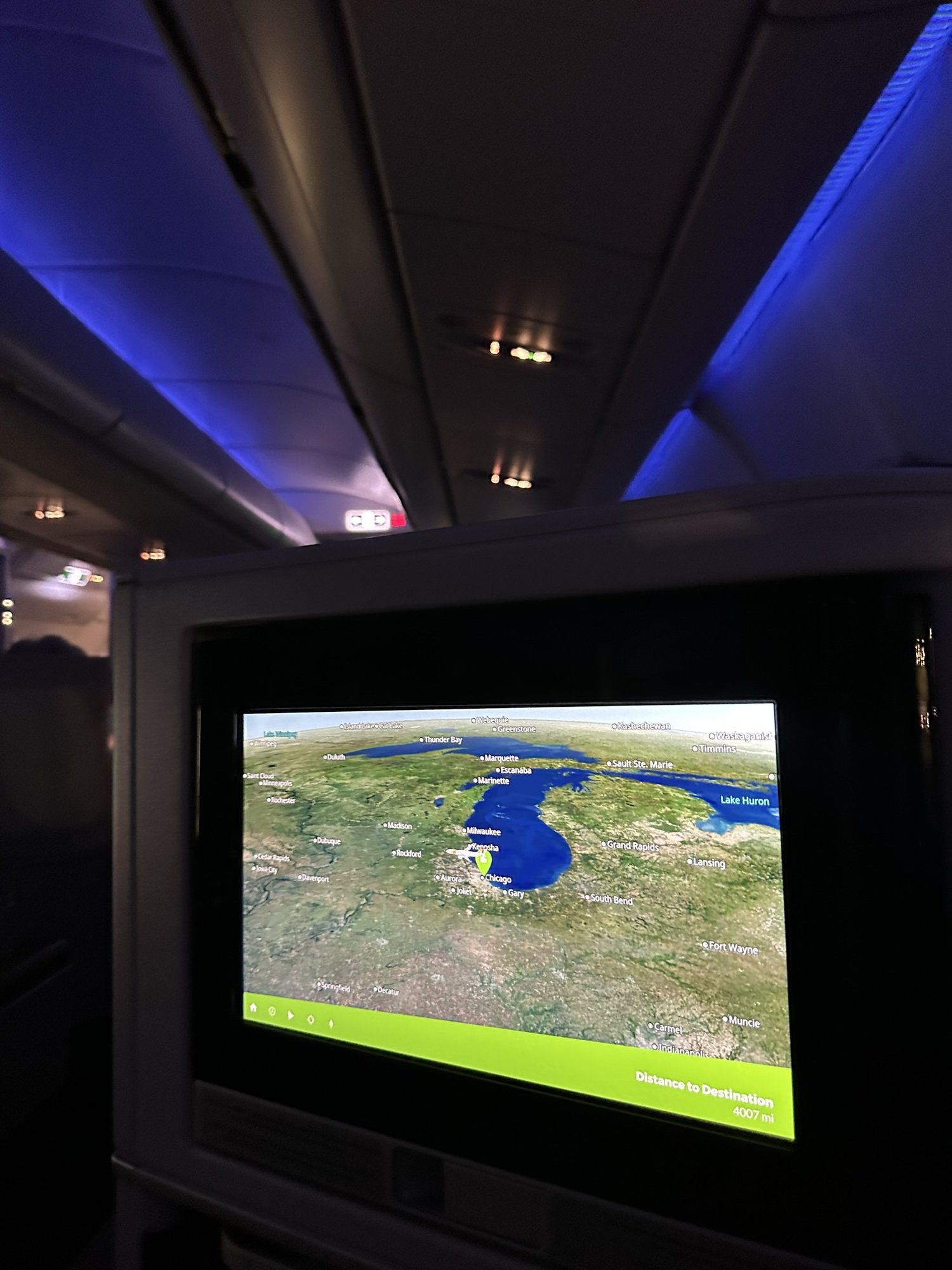 Boarding completed at approximately 9:50, and we pushed back from the gate roughly 15 minutes later. After a short taxi, we took off right on time at 10:15. The climb offered beautiful nighttime views of Chicago off the right-hand side of the aircraft, although I struggled to get a good picture. After 20-or-so minutes, we climbed above 10,000 feet and the cabin crew began service.