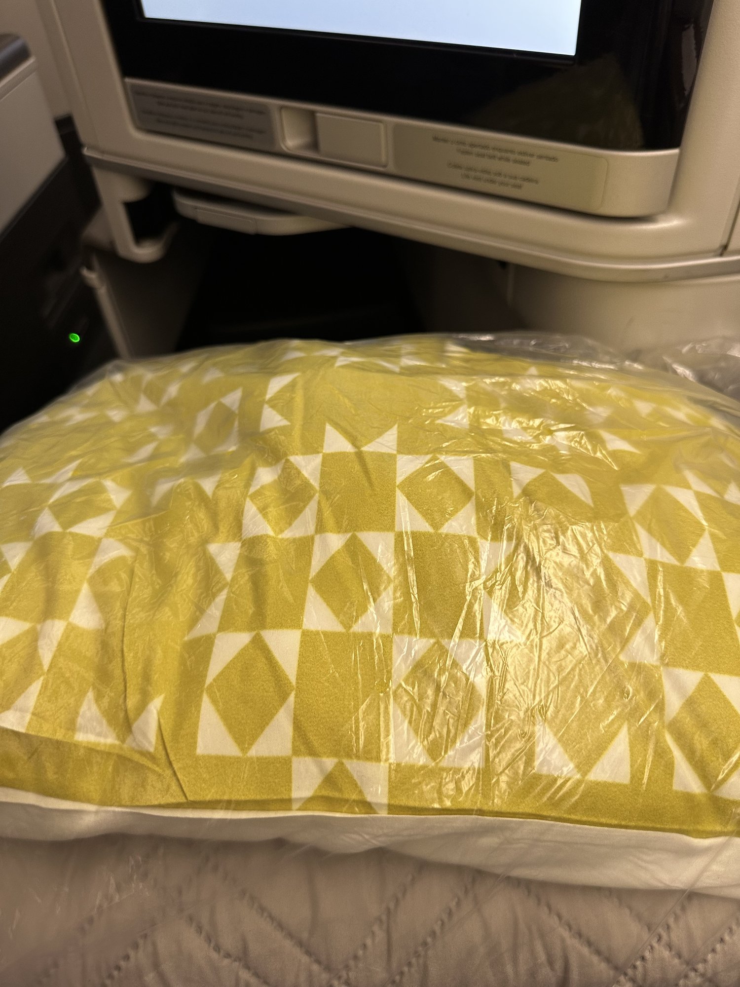 As minute of a detail as it is, I found the two bottles of water rather generous, as other business class flights I’ve taken have either offered no bottle of water or one. Even though you could presumably always ask for water, particularly on overnight flights, it’s great to have water already at your seat when you wake up dehydrated, rather than to have to ask. It’s the little things that make all the difference! Further waiting at my seat was a large, colorful pillow (which was surprisingly comfortable) and a mid-weight blanket.