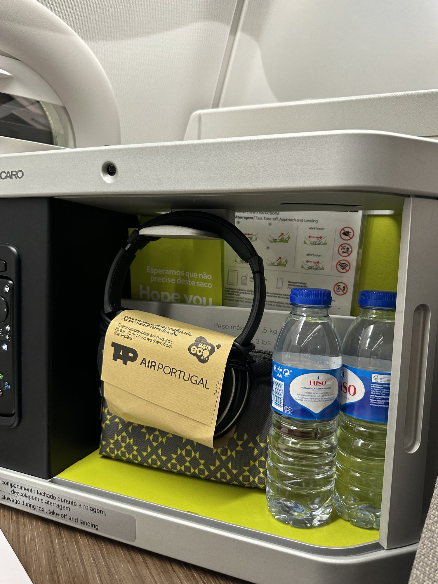 Behind my right shoulder, a sizeable cabinet held all the standard seat essentials; A pair of noise-cancelling headphones, a colorful TAP amenity kit, and two full-size bottles of water, in addition to the standard safety cards and air sickness bag.