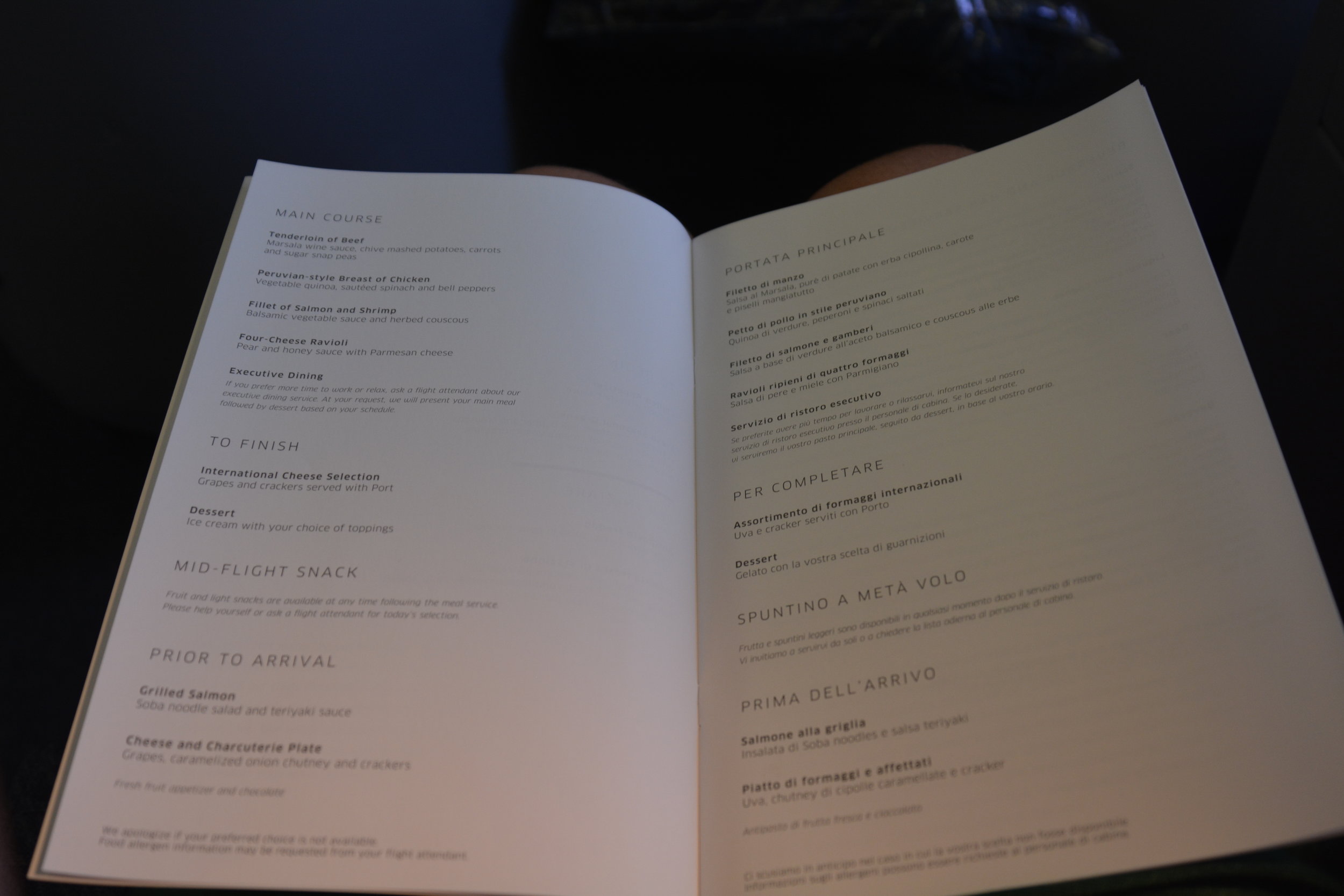 The cabin slowly filled up and we pushed back around 10:40am. Take off was smooth, and once over France, lunch was served. Service began with drink orders and mixed nuts. To start, a shrimp appetizer was served with a side salad. The flight attendants also brought around a bread basket, from which I had garlic bread. It was a pretty good appetizer, however the salad was lacking in taste. For the main course, I selected the four-cheese ravioli with cheese sauce. The ravioli was pretty good, but the cheese sauce was overpowering and too filling.